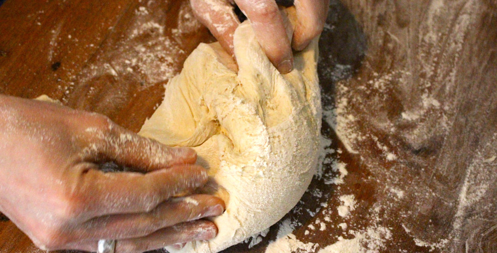 250 g Mehl, Wasser und Hefe in eine große Rührschüssel geben. Mit dem Knethaken der Küchenmaschine etwa 5 Minuten auf kleiner Stufe vermengen und anschließend für ca. 30 Minuten beiseite stellen. Danach das restliche Mehl, Salz, Zucker und Öl (oder weiche Butter) hinzugeben und erneut mit dem Knethaken der Küchenmaschine 10 Minnten lang auf kleiner Stufe zu einem geschmeidigen Teig verarbeiten. Die Schüssel mit Frischhaltefolie abdecken und an einem warmen Ort für ca. 45 Minuten gehen lassen.