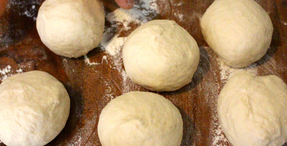 Den Backofen auf 250 Grad Celsius Ober-/Unterhitze vorheizen. Den Teig auf eine bemehlte Arbeitsfläche geben und mit Hilfe einer Küchenwaage sowie einer Teigkarte o.ä. in 8 Portionen à 80 g aufteilen. Die Teiglinge zunächst alle rund formen, dann nochmals etwas länglich ausrollen.